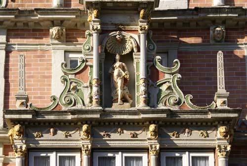 Bekrönung der Auslucht mit einer vollplastischen Lukretia-Figur. Diese antike Gestalt steht hier für die bürgerlich-republikanische Tugend.