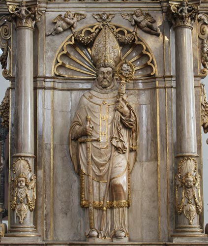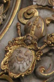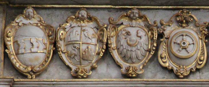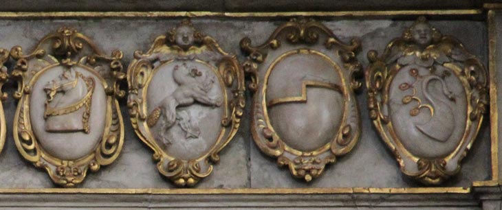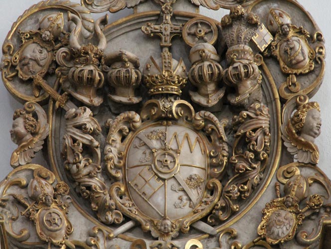 Auch wenn sie deswegen nicht so ins Auge springt wie bei den anderen Epitaphien, haben wir hier doch sehr umfangreiche Heraldik. Bei genauem Nachzählen kommt man auf insgesamt 21 Wappen, alle im oberen Bereich jenseits der vor einer Muschelnische stehenden und den Besucher frontal anblickenden Bischofsfigur in vollem Ornat. Oben befindet sich in der Mitte des gesprengten Segmentbogengiebels, dessen Oberkanten innen in schneckenförmig eingerollten Voluten enden, das große Amtswappen des Fürstbischofs. Es ist umgeben von insgesamt vier kleineren Wappen mit bischöflichen Insignien. Und im Gebälk zwischen der Nische mit der Bischofsfigur und dem gesprengten Giebel befindet sich eine Reihe von 16 Ahnenwappen. Von diesen 16 bilden 8 eine durchgehende Reihe in der Mitte, und jeweils vier folgen den Flächen des Bereiches über den Säulenkapitellen nach außen. So kommt es, daß insgesamt 10 Wappenschilde von den 16 zum Betrachter weisen, zwei nach rechts und zwei nach links. Alle Wappenschilde sind als ovale Kartuschen ausgebildet.