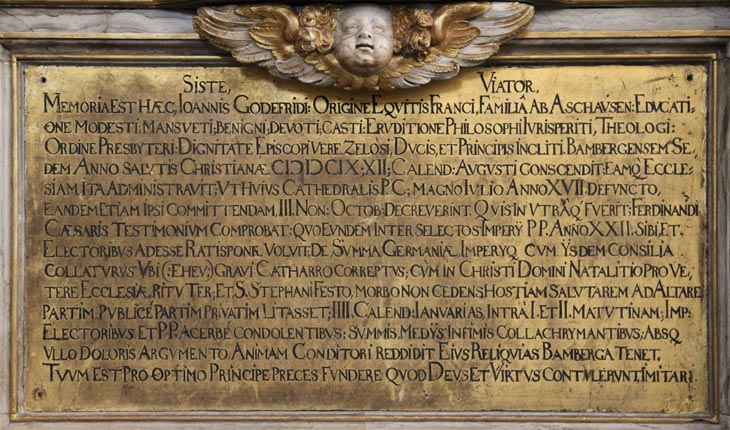 Johann Gottfried von Aschhausen wurde 1593 Dechant auf der Comburg und im Würzburger Stift Haug, 1609 Bischof von Bamberg, 1610 Dompropst zu Würzburg, 1617 Bischof von Würzburg. Gestorben ist er im Jahre 1622 am 29.12. Sein Amtswappen ist wie folgt aufgebaut: