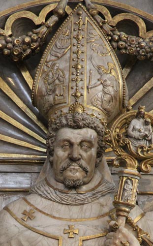 Details, links von der Sockelzone seitlich der Inschrift, rechts Kopf von Johann Gottfried von Aschhausen in vollem fürstbischöflichen Ornat. Man erkennt in der Vergrößerung den ungeheuren Detailreichtum und die vorzügliche bildhauerische Qualität des Epitaphs.