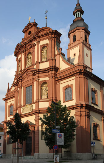 Das Kirchenschiff ist eine dreischiffige, gewölbte Freipfeilerhalle mit Emporen in den Seitenschiffen. Die beiden Westtürme sind vergleichsweise eigenartig. Ihre außergewöhnliche Position eingerückt hinter der Fassade und in relativ enger Stellung zueinander kommt daher, daß man Teile der bereits vorhandenen Kirche weiterverwendet hat. Diese beiden Türme stammen noch aus romanischer Zeit, und beim ganz anders und vor allem viel breiter konzipierten barocken Neubau war ihre neue Position innerhalb des Kirchensaales hinter der Fassade, die seitlich weit über den Vorgängerbau hinausragt. Äußerlich wurden die Türme barockisiert, so daß man ihr wahres Alter nicht auf den ersten Blick erkennt. Und innen wurden sie sehr geschickt eingebunden: Es entstand ein tiefes Eingangsjoch, das der Besucher als erstes durchschreitet, ehe er in die sich weit öffnende, lichte Emporenhalle tritt. Wendet er sich nach hinten, sieht er zwischen die Türme eingepaßt die Orgelempore. Die Lücke zwischen den Türmen wird ganz oben mit einem aufwendig geschmückten Bogen überspannt, und das darauf angebrachte dekorative Wappen lenkt alle Blicke auf sich - vergessen ist der Grund für diese komische Engstelle. Und noch ein Teil ist älter als der barocke Neubau: Der aus der Gotik stammende und ebenfalls sehr schmal dimensionierte Chor ist einschiffig und wurde im oberen Teil durch Aufstockung barockisiert; so kommt es, daß über spitzbogigen Maßwerkfenstern barocke Rundfenster liegen.