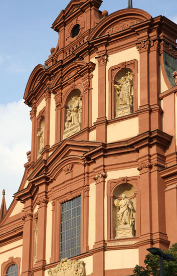 Das Schaustück der Kirche und die Hauptleistung von Joseph Greissing ist die Gestaltung der dreigeschossigen Westfassade. Es gibt hier insgesamt fünf Fensterachsen, wovon je eine Achse den Seitenteilen entspricht und drei Achsen als Mittelteil zusammengefaßt werden. Dieser Mittelteil springt zweimal gebrochen mit abgeschrägten Seiten polygonal nach Westen vor. Die Betonung des Mittelteiles wird dadurch unterstützt, daß das umlaufende Traufgesims unterschiedliche Höhen in der Mitte und an den Seiten hat, was dem höher aufragenden Mittelstück eine zusätzliche architektonische Dramatik verleiht. Dieser Versatz wird geschickt erzeugt: Das Gesims über dem Erdgeschoß hat überall noch die gleiche Höhe. Doch darüber wird eine kleine Zwischenzone eingebaut, die auf den Seitenfacetten wie ein Brüstungsfeld unter den Statuen wirkt und die in der mittleren Facette die große, unten näher beschriebene Wappenkomposition aufnimmt. Dann folgt wie selbstverständlich ein dünnes Gesims, das nur an den drei Mittelteilfacetten existiert. Dadurch rutscht das eigentliche erste Obergeschoß des Mittelteiles nach oben, mit folgen für alles darüber Liegende. Durch diesen Trick wird das Auge des vor der Fassade stehenden Betrachters genarrt: Man kennt instinktiv die Gesetze der Zentralperspektive, und die größere Distanz beider Gesimse im Mittelteil im Vergleich zu den Seitenteilen wirkt so, als würde der Mittelteil viel weiter nach vorne schwingen als er tatsächlich tut. Das Obergeschoß des Mittelteils wird als viel näher als die Seitenteile wahrgenommen, und der Dreiecksgiebel in der Mittelachse zieht das Hauptgesims noch weiter optisch nach oben, so daß der Betrachter das untere Gesims leicht schräg von unten, das obere Gesims aber fast senkrecht von unten zu sehen meint. So wird eine viel größere Tiefe der Fassade vorgetäuscht. Verstärkt wird dieser Effekt durch die Tatsache, daß das Fenster in der Mittelachse viel größer ist als die Fenster in den beiden äußeren Seitenachsen, auch dies läßt das mittlere Fenster viel näher erscheinen. Wir müssen auch in Betracht ziehen, daß zur Bauzeit die räumliche Situation beengter war als heute, und daß der damalige Betrachter viel näher dran stand, nur heute hat der Platz mehr Weite, so daß man die Fassade von weiter weg sehen kann. Deshalb traf damals zur Bauzeit das über die durch diese Tricks erreichte Plastizität der Fassade Gesagte noch mehr zu als heute. Weiterhin korrespondiert diese Höhenstaffelung der Staffelung im Innern: Wir haben oben gesehen, daß das Mittelschiff 3,35 m höher ist als die Seitenschiffe und daß es sich im Grunde um eine Staffelhalle handelt. Genau dies wird hier nach außen weitergegeben: Äußerer Aufbau entspricht hier innerem Aufbau, der Versatz im Hauptgesims entspricht der dahinterliegenden Architektur.