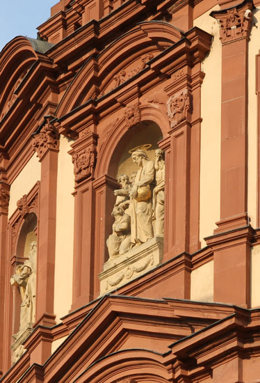 Die Westfassade ist reich mit Nischen, Gesimsen und Aedikulen plastisch durchmodelliert, was in der Fülle eine lebhafte und malerische Licht- und Schattenwirkung erzielt. Im Erdgeschoß haben wir einen dreieckigen Giebel über dem Portal. Im mittleren Geschoß haben wir zwar auch nur einen Dreiecksgiebel, der aber wesentlich breiter ist, ein stärkeres Profil besitzt und zusätzlich verkröpft ist. Allein dadurch wird er bereits gegenüber dem unteren Giebel aufgewertet. Aber der Giebel wird durch die perspektivisch wahrgenommenen Hauptgesimsstück der Seitenfacetten optisch nach außen verlängert, was ihm zusätzliche Bedeutung gibt. Und ganz oben ist die lebhafteste Giebel-Landschaft zu sehen: Die beiden Seitenfacetten des Mittelteils tragen je einen Segmentbogengiebel, ein weiterer ist dazwischen etwas tiefer über der mittleren Figurennische angebracht, darüber ist eine Balustrade zwischen den Seitengiebeln gespannt, und über dieser erhebt sich ein Aufsatz mit Ovalfenster (früher war dort eine Uhr angebracht) und abschließendem Dreiecksgiebel darüber. So wird mit den Giebeln eine Steigerung von unten nach oben aufgebaut, eine Staffelung in Ausmaßen, plastischer Durchformung, Größe und Detailreichtum von unten nach oben. Diese Vertikaltendenz wird besonders deutlich, wenn man mit gedachten Hilfslinien die Giebelbereiche verbindet: Wie ein riesiges V, wie ein großer Keil sitzt das Giebelsystem in der Fassade, erzeugt gleichsam einen himmelwärts strebenden, nach oben immer breiter werdenden Sog.