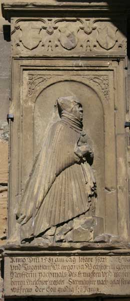 Wappen Neuffer / Neyffer: Margarete Neuffer, gest. 5.3.1581, ist die Tochter des Junkers Hans Neyffer (gest. 1508). Sie entstammt einer angesehenen Tucher- und Siederfamilie. Auf diesem Stein ist aufgrund der fortgeschrittenen Verwitterung nicht mehr viel zu erkennen außer einem Schrägbalken, der mit drei Objekten belegt ist. Hingegen wird das Wappen abgebildet in der Haller Chronik nach Georg Widman und Johann Herolt, um 1600 entstanden: In Schwarz ein goldener Schrägbalken, nach der Figur belegt mit drei roten Salzsiederwerkzeugen (Schieber oder Schaufeln mit Handgriff), auf dem Helm mit schwarz-goldenen Decken ein wachsender Mann in schwarzer Gewandung und mit schwarzem Hut, in jeder Hand ein rotes Salzsiederwerkzeug haltend.