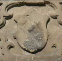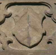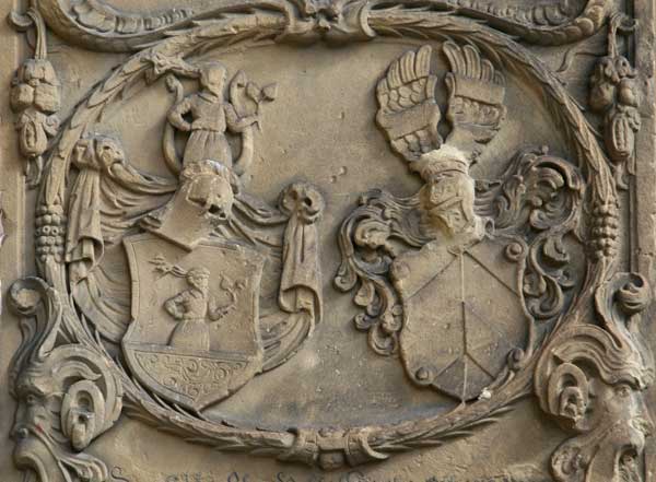 Die vier Wappenschilde in den Ecken sind sehr zerfressen. Optisch rechts unten ist eine Waage zu erkennen, auf den anderen kaum noch etwas. Oben links (optisch) könnten zwei gekreuzte Stäbe sein.