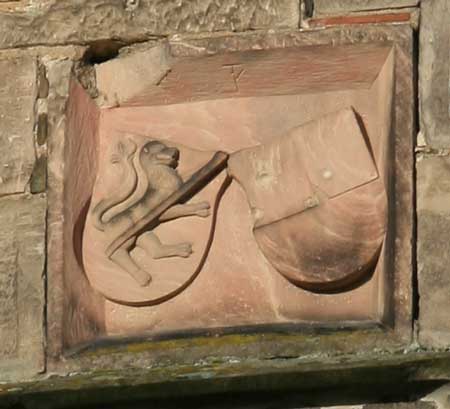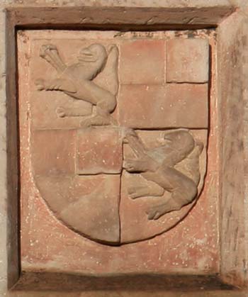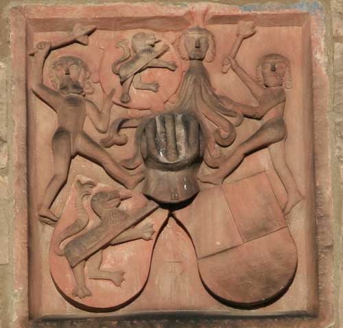 Abb.: Schaumberg-Wappen am Nordostturm (Wappen Nr. 17), einer von drei dort befindlichen Wappensteinen. Hier finden wir eine variierte Darstellung als geviertes Wappen ohne Oberwappen: