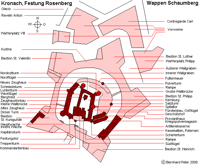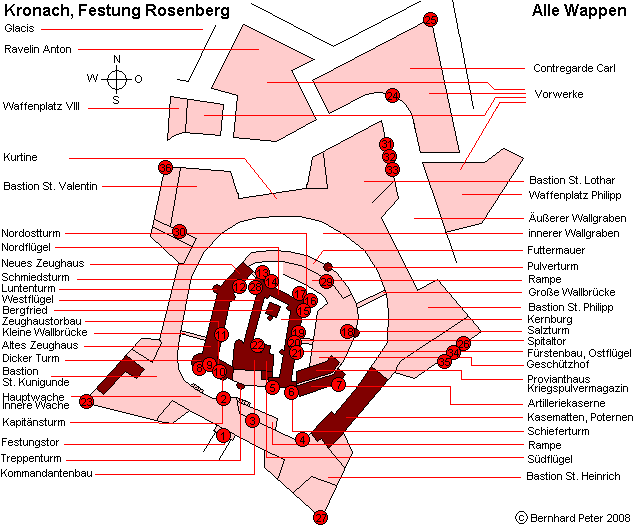 Kronach (Oberfranken): Festung Rosenberg, bis zu G. v. Schaumberg - Ausbau unter P. v. Henneberg - Ausbau unter W. v. Redwitz - Nordostturm - Schmiedsturm - Dicker Turm - Fürstenbau und Spitaltor- Ausbau unter V. v. Würtzburg - Zeughäuser - Südflügel - Zeughaustorbau - Festungstor - Bastion St. Valentin - Bastion St. Kunigunde - Bastion St. Heinrich - Bastion St. Philipp - innere Mauer der Bastion - Bastion St. Lothar - innere Mauer Südkurtine - Artilleriekaserne - Vorwerke
