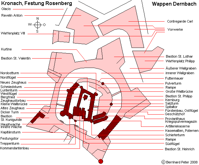 Kronach (Oberfranken): Festung Rosenberg, bis zu G. v. Schaumberg - Ausbau unter P. v. Henneberg - Ausbau unter W. v. Redwitz - Nordostturm - Schmiedsturm - Dicker Turm - Fürstenbau und Spitaltor- Ausbau unter V. v. Würtzburg - Zeughäuser - Südflügel - Zeughaustorbau - Festungstor - Bastion St. Valentin - Bastion St. Kunigunde - Bastion St. Heinrich - Bastion St. Philipp - innere Mauer der Bastion - Bastion St. Lothar - innere Mauer Südkurtine - Artilleriekaserne - Vorwerke