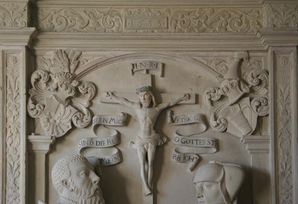 Unterhalb eines Gekreuzigten sind die beiden Ehepartner abgebildet, mit jenem durch ein Spruchband verbunden: "Meine Sind (Sünden) die rew-wen (reuen) mich" bzw. "Uf die Gn-ad Gottes st-irb ich". Rechts und links des Gekreuzigten befinden sich die beiden Vollwappen der Ehepartner bzw. ihrer Väter.