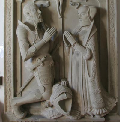 Das Epitaph wurde bereits zu Lebzeiten in Auftrag gegeben. Dies erklärt, warum die Ehefrau Anna in höfischer Gewandung und nicht in Witwentracht portraitiert wurde. Beide Ehepartner sind nebeneinander abgebildet, er auf einer kleinen Stufe knieend, sie stehend, und doch ist der Kopf von Wolf noch etwas höher als der seiner Frau. Beide sind einander zugewandt mit betend zusammengelegten Händen. Wolf trägt eine Rüstung, Helm und Handschuhe aber hat er vor sich abgelegt.