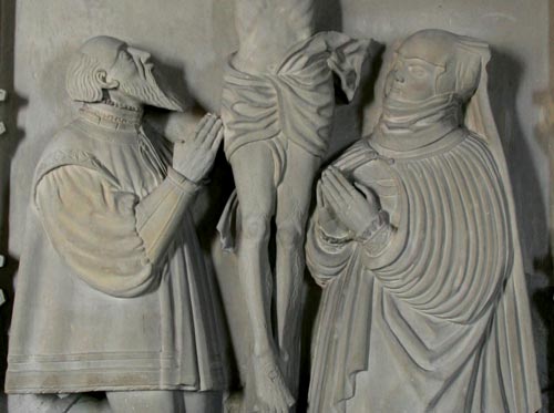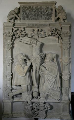 Hier ist im Gegensatz zu den anderen Epitaphien der Herr nicht in Rüstung, sondern in Festkleidung dargestellt. Seine Frau, die ihn 23 Jahre überlebte, trägt ein Trauerkleid.
