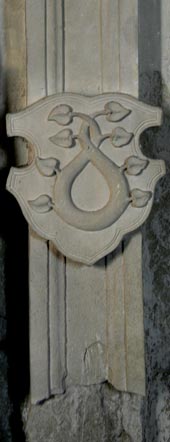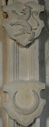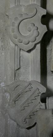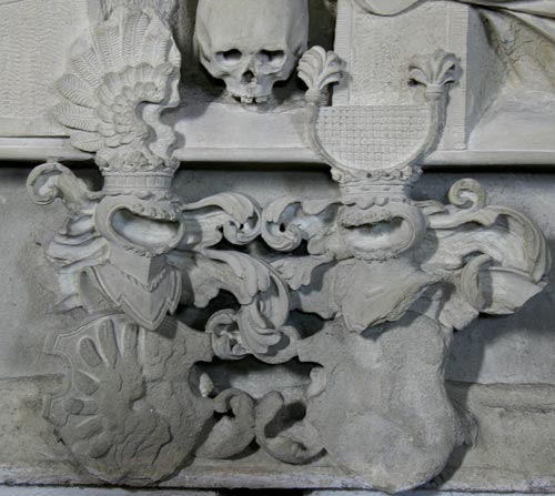 An den beiden seitlichen Pilastern befinden sich je vier Wappenschilde, optisch links für den Ehemann, optisch rechts für die Ehefrau. Die Schilde des Ehemannes sind alle nach innen gewendet, aus Courtoisie. 7 der 8 Wappen sind gut erhalten, lediglich das ganz rechts unten ist komplett verwittert.