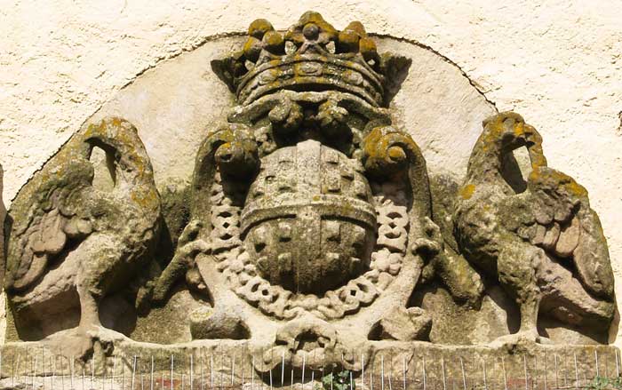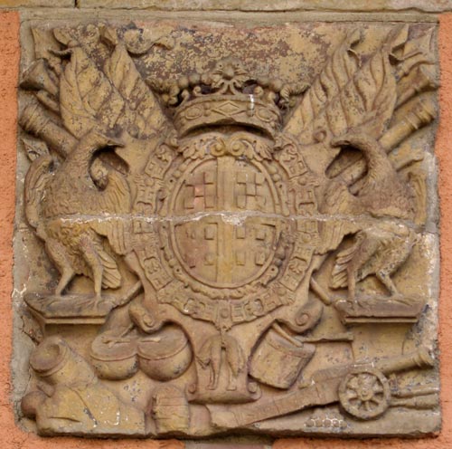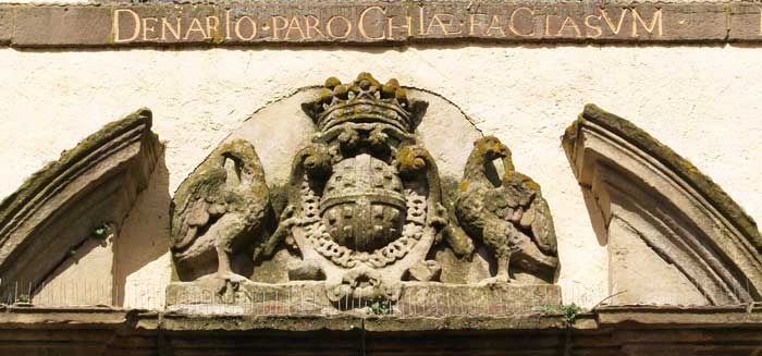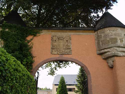 Über dem großen Portal befindet sich ein von zwei Adlern gehaltenes Wappen der Familie Elter/Autel. Es zeigt in Rot ein durchgehendes, goldenes Kreuz, begleitet von 18 goldenen Schindeln, in jedem oberen Winkel 5 (2:1:2), in jedem unteren Winkel 4 (2:2).