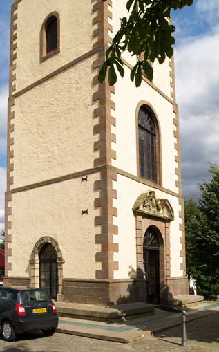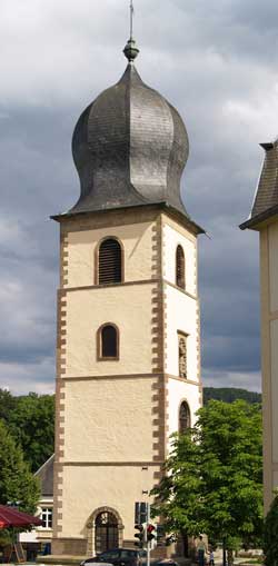 Der Glockenturm ist das einzige Überbleibsel der Michaelskirche, die 1453 durch burgundische Heere zerstört wurde. Graf Johann Friedrich von Elter/Autel ist der Erbauer des neuen Glockenturms der alten Kirche im Jahre 1707, nachdem der alte im Juli 1706 durch Blitzschlag abgebrannt war. Der Turm wurde also in barocker Zeit wiederhergestellt und mit einer zeitgemäßen Haube versehen. Heute dient er oben als Glockenturm, unten als Eiscafé. Die alte Pfarrkirche wurde im 19. Jh. abgetragen. Das Glockenspiel stammt aus dem 20. Jh.