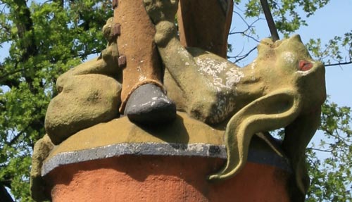 Interessanterweise sehen wir auf einer Seite das österreichische Wappen (in Rot ein silberner Balken), wobei die spitz nach unten ausgezogene Form einfach künstlerische Laune ist. Der Grund ist, daß die Mutter von Christoph I. Markgraf v. Baden (13.11.1453 - 19.4.1527, reg. 1475 - 1515), der zur Zeit der Brunnenaufstellung 1494 regierte, Katharina v. Österreich (ca. 1420 -11.9.1493) war.