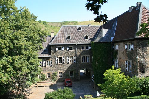 In der Durchfahrt befindet sich eingemauert der Grabstein für Diether Kämmerer von Worms genannt von Dalberg (- 9.2.1530) und seine Gemahlin Anna von Helmstatt (-28.8.1528), welcher schwer beschädigt aus der zerstörten Kirche hierhin gerettet wurde. Weiterhin ist in der Tordurchfahrt ein modernes Allianzwappen Salm / Böselager eingemauert, passend zu Franz Karl Alfred Emanuel Aloysius Josef Maria Prinz zu Salm-Salm und Maria von Böselager (geb. 3.12.1923), die am 30.10.1951 heirateten, und diese Jahreszahl ist auch auf dem Stein eingehauen. Franz Karl Alfred Emanuel Aloysius Josef Maria Prinz zu Salm-Salm ist der Sohn von Franz Emanuel Konstantin Prinz zu Salm-Salm und Maria Anna von Dalberg.