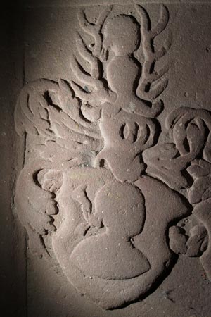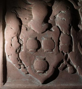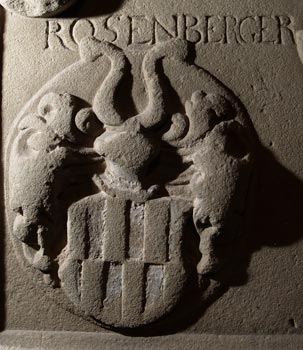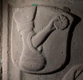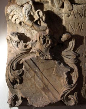 Abb.: Aufnahme der beiden unteren Einzelwappen mit Seitenblitz. Optisch links ein Schrägbalken mit Obereck, gewendet, als Helmzier ein Jagdhorn, optisch rechts ein Fingerring mit Stein, Helmzier nicht mehr erhalten. Held ordnet das Wappen mit dem Ring den von Niefern zu (S. 146).