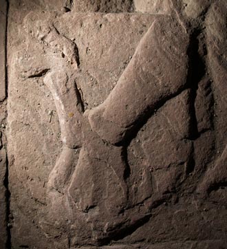 Detail: Zu Füßen des Ritters eine widersehende hingekauerte Tierfigur. Die gepanzerten Knöchel des Ritters tragen Sporen mit sternförmigen Rädern.