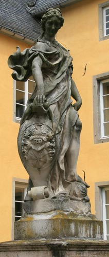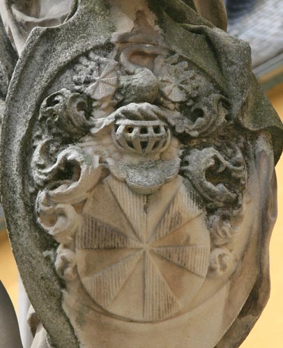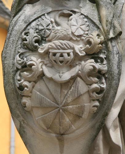 Die Wappen gehören zu Maximilian Hartard Freiherr Waldbott v. Bassenheim (- 16.2.1734), Erbburggraf zu Drachenfels, Herr zu Gudenau, Merl, Odenhausen, Villip, Ödingen, Nothhausen, Nierendorf, Rüxheim, Billig, Amtmann zu Godesberg und Mehlem, kurkölnischer Kämmerer, Geheimrat, 1713 Obersthofmarschall (optisch linke Statue, unten im Bild und mit Detailausschnitt), vermählt mit Maria Magdalena Rosina Adolphina Waldbott v. Bassenheim (- 29.10.1759, optisch rechts Statue, oben im Bild und mit Detailausschnitt). Maria Magdalenas Bruder Johann Jacob war übrigens Direktor der Ritterschaft und Hofkammerpräsident, Herr zu Bornheim, Olbrück, Waldorf und Heimertzheim, Burggraf zu Drachenfels, Geheimer Conferenz- und Staatsminister, Amtmann zu Brühl und Königsdorf, Amtsverwalter zu Hülchrath und Erprath.