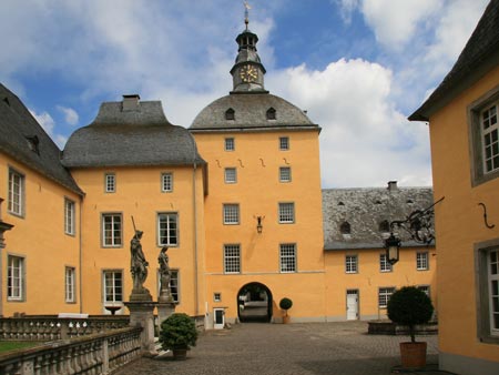 Abb.: Blick in den Zwischenraum zwischen Herrenhaus zur Linken und innerer Vorburg zur Rechten. In der Bildmitte der mächtige Torturm, links daneben der ehemalige alte Wohnturm mit geschweiftem Dach. Die weiter unten besprochenen Statuen mit Wappenschilden flankieren links im Bild den Zugang zum Herrenhaus. Photo 2009
