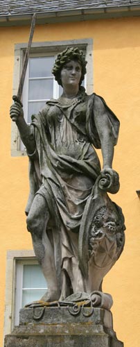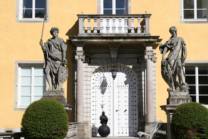 Diese Statuen sind Teil eines repräsentativen Ausbauprogrammes, das dem Schloß entsprechend der relativ neuen reichständischen Würde neuen Glanz verleihen soll: Balustrade am Torturm, Portal des Herrenhauses mit den beiden Statuen und die barocke Terrasse zum See gehören der selben Bauphase an. Repräsentation war das Ziel und Hervorhebung des hervorgehobenen Status der Schloßbesitzer. Ein nettes Detail zeigt dieses an: Der Torturm zur inneren Vorburg bekam toskanische Säulen, das Portal zum Herrenhaus Säulen mit ionischen Kapitellen und schließlich finden wir in der Kapelle korinthische Kapitelle, eine klassische Abstufung, die hier für die Abgrenzung der Bereiche und Rangstufen für Untertanen, Herr und schließlich Gott steht.