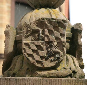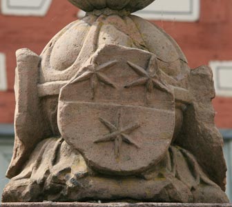 Abb. links: Wappen der Grafen von Wertheim, geviert: Feld 1 und 4: Grafen von Wertheim, geteilt, oben in Gold ein schwarzer aus der Teilung hervorkommender Adler, unten in Blau 3 (2:1) silberne Rosen mit goldenem Butzen. Feld 2 und 3: Herrschaft Breuberg, in Silber zwei rote Balken. Abb. rechts: Wappen der Markgrafen von Baden, in Gold ein roter Schrägbalken. Die Mutter von Georg II. Graf v. Erbach (18.1.1506 - 27.8.1569) war Maria v. Wertheim (geb. 23.2.1485), und die Mutter von Georgs Frau, Elisabeth Pfalzgräfin bei Rhein zu Simmern (13.2.1520 - 18.2.1564), war Beatrix v. Baden (22.1.1492 - 4.4.1535). So ist der Brunnen insgesamt eine Ahnenprobe; die beiden zugehörigen Väter waren Eberhard XI. Graf v. Erbach (22.4.1475 - 1539) sowie Johann II. Pfalzgraf bei Rhein zu Simmern, Herzog v. Bayern (21.3.1492 - 18.5.1557).