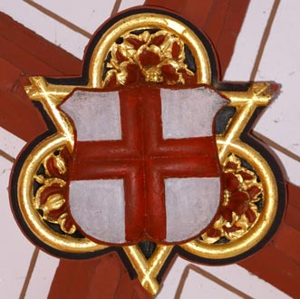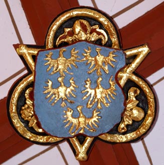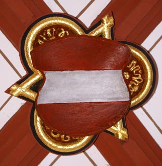 Linke Abb.: Schlußstein mit dem Stadtwappen von Freiburg (in Silber ein durchgehendes rotes Kreuz), rechte Abb.: Schlußstein mit dem Wappen des Erzherzogtums Österreich, in Rot ein silberner Balken.