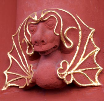 Linke Abb.: Schlußstein mit dem Wappen von Altösterreich, Niederösterreich, in Blau 5 (2:2:1) gestellte goldene Adler. Rechte Abb.: Drachen-Verzierung an der Rückwand der Bogenhalle.