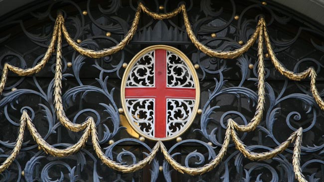 ein durchgehendes rotes Kreuz) in einer schmiedeeisernen