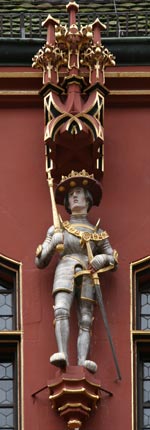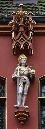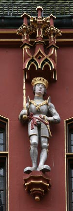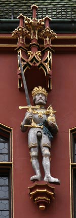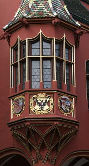 Das historische Kaufhaus in Freiburg am Münsterplatz, 1378 erstmalig urkundlich erwähnt, ist nicht nur architektonisch, sondern vor allem auch heraldisch ein Schmuckstück. Das Kaufhaus der Stadt war das wirtschaftliche Zentrum der mittelalterlichen Stadt, hier wurden Handelswaren gelagert, umgeschlagen, verzollt, insbesondere von den durchreisenden Kaufleuten. Es war der Schlüsselort des Warenkreislaufs und Geldverkehrs und diente der Kontrolle des geregelten Ablaufs der Waren- und Geld-Geschäfte, insbesondere der der auswärtigen Kaufleute, dem Schutz der einheimischen Kaufmannschaft (die erst später ebenfalls ihre Waren hier vorführen mußten) und dem wirtschaftlichen Wohl aller Beteiligten. Es war Lager, Bank, Behörde, Verkaufsort, Marktkanzlei und Pfandhaus zugleich. So war es auch strategisch günstig in relativer Nähe zum Schwabentor gelegen, durch das die wichtigste Handelsroute in die Stadt hineinführte. Was das Rathaus für die Politik und das Münster für den Glauben war, war das Kaufhaus für die Wirtschaft der Stadt. Oben wurde bereits auf das Datum der erstmaligen Erwähnung hingewiesen, das war das erste Kaufhaus, nachdem sich die Stadt gerade von den Grafen von Freiburg freigekauft hatte und das wirtschaftliche Leben selber in die Hand nahm. Das heutige Gebäude stammt freilich aus späterer Zeit. Daß sich die Stadt aber nach ihrem Freikauf den Habsburgern unterstellt hatte, ist unübersehbar, das gesamte Figuren- und Wappenprogramm ist habsburgisch.