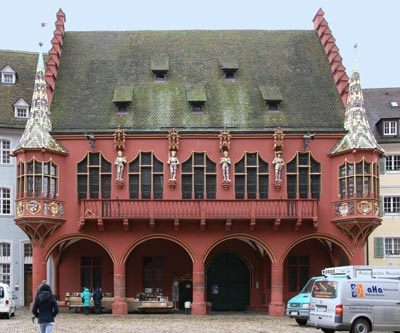 Mehrere Umbauten mußte das alte Kaufhaus erdulden, eine neugotische Renovierung 1880/84 richtete mehr Schaden als Nutzen an, was 1924/25 wieder in besserer Einsicht korrigiert wurde unter weitgehender Wiederherstellung des Zustandes vor 1880. Eine 1987-91 durchgeführte Komplettsanierung des wertvollen Gebäudes ließ das Gebäude in bestmöglicher Authentizität erstrahlen und machte es zugleich für die Bürgerschaft nutzbar. Auch im Innern ist Wappenschmuck, so sind im Saal im Obergeschoß die Wappen der Amtsträger der Jahre 1621/32 zu sehen, allerdings in 1924-25 von Matthias Kobolt erneuerter Form. Besondere politische Bedeutung erlangte dieser Bau übrigens 1946-47, als hier die Beratende Landesversammlung tagte und vom 20.5.1947 bis 1951 der badische Landtag, als Freiburg die Hauptstadt eines eigenen Landes Baden war. Erst nach der Volksabstimmung am 9.12.1951 schloß sich Baden am 25.4.1952 mit Württemberg-Baden und Württemberg-Hohenzollern zum Bundesland Baden-Württemberg zusammen.