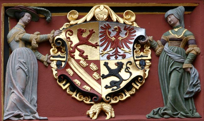 Die Wappen werden auf den folgenden Seiten im Detail diskutiert, hier soll die Aufmerksamkeit nur auf die Tatsache gelenkt werden, daß einige wenige der insgesamt 10 Wappen mit exquisiten Schildhaltern ausgestattet sind, z. B. Greifen wie im unteren Beispiel, oder Menschen in zeittypischer Gewandung. Schildhalter finden sich jeweils an den beiden äußeren Wappendarstellungen jeden Erkers.