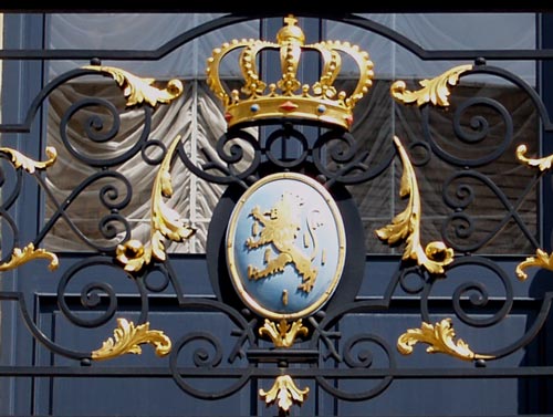 An der Vorderfront finden sich mehrere Wappen an den schmiedeeisernen Schmuckstücken. Ganz links gibt ein schmiedeeisernes Tor Zugang zu einem winzigen formalen Gärtchen mit zurückgesetztem Renaissance-Portal, und über diesem Gitter sehen wir das luxemburgische Staatswappen in einer modernen Form: