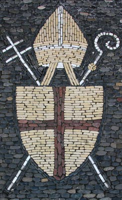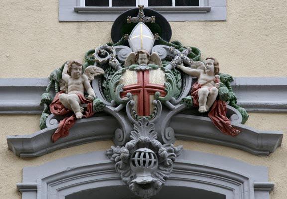 Zwischen erstem und zweitem Obergeschoß unterbricht das 1881/82 während eines Umbaus durch Friedrich Maier (erzbischöflicher Architekt) angebrachte erzbischöfliche Wappen das obere der beiden die Geschosse jeweils trennenden Gurtgesimse. Früher war hier eine nicht mehr erhaltene Fama (Allegorie des Ruhms) aus der Hand von Johann Christian Wentzinger angebracht. Das Wappen ist also ein Produkt des Neobarocks, versucht die üppige Fülle barocker Gestaltungen zu imitieren, schafft aber mangels der Souveränität des Originalstils eher ein eng gedrängtes Konglomerat von Symbolen. Im Zentrum sieht man auf goldenem Grund das durchgehende rote Kreuz der Erzdiözese Freiburg. Darüber ruht eine Inful auf einem geflügelten Engelskopf. Dahinter steht pfahlweise das erzbischöfliche Vortragekreuz mit zwei Querbalken übereinander. Krummstab und Vortragekreuz (sehr schwertähnlich gestaltet, aber aufgrund der Entstehungszeit ist nur ein Kreuz möglich) sind hinter der von grünen Palmzweigen eingerahmten Schildkartusche schräggekreuzt, zwei von roten Tüchern mehr ent- als verhüllte Putten rechts und links der Schildkartusche werden von den grünen erzbischöflichen Fiocchi (sollten eigentlich 2x 10 (1:2:3:4) sein), die mit den Knotenschnüren aus dem über allem schwebenden Galero (müßte auch grün sein) hervorkommen, mit in die Gesamtkomposition einbezogen, wodurch diese nicht wie üblich sauber und zählbar nebeneinander herabhängen, sondern etwas unschön zur Seite gedrängt werden und teils rechts, teils links neben den Putten zu sehen sind und auch teilweise verdeckt sind. Vergleichsweise puristischer ist die Darstellung des erzbischöflichen Wappens am Ordinariat.