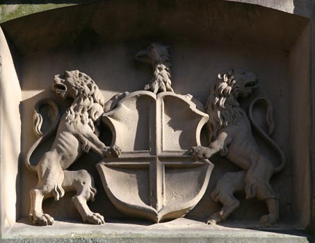 Für uns ist hier aber weniger der Mönch, sondern mehr das darunter befindliche Wappen von Interesse, ein von zwei widersehenden Löwen gehaltener Schild mit dem Freiburger Stadtwappen, in Silber ein durchgehendes rotes Kreuz, hier freilich aus gelbem Sandstein und nicht farbig gefaßt.