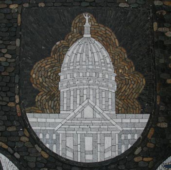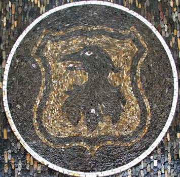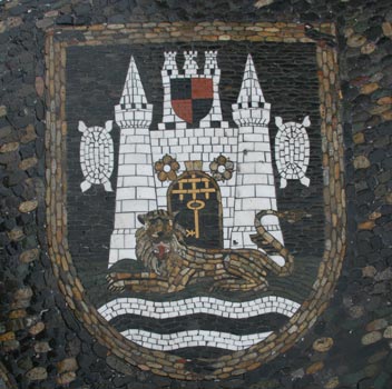 Abb. links: Stadtwappen von Padua (Italien, Lombardei), in Silber ein durchgehendes rotes Kreuz; der Schild ist golden gekrönt (Unterscheid zu Freiburg). Abb. rechts: Stadtwappen von Guildford (England, Surrey). Das Wappen zeigt innerhalb eines goldenen, mit drei schwarzen, rotbewehrten Krähen belegten Bordes über einem dreimal wellenförmig von Silber und Blau geteilten Wellenschildfuß in Schwarz auf einem grünen Berg zwischen zwei silbernen Wollsäcken eine silberne Burg mit drei Zinnentürmen, der mittlere Turm belegt mit einem von Frankreich und England gevierten Schildchen, die äußeren Türme mit spitzem Helm, die Mauer über dem Tor mit zwei Rosen balkenweise belegt, unter dem goldenen Fallgatter ein pfahlweise gestellter goldener Schlüssel, vor dem Tor liegend ein goldener, hersehender Löwe (sable, on a mount Vert between two woolpacks a castle with three towers Argent, the central one triple-towered and charged with a shield of the Royal Arms of France and England quarterly, the outer towers each surmounted by a spire, under the battlements two roses in fesse and within the open port beneath a portcullis a key all Or, on the mount before the port a lion couchant guardant also Or, the base barry wavy Argent and Azure, all within a bordure Or charged with three Cornish choughs proper). Zu diesem Stadtwappen würde noch eine Helmzier gehören, aus einer goldenen Krone, deren Zacken aus zwei Eicheln mit je einem Blätterpaar zwischen drei Ähren bestehen, wachsend ein silberner Löwe, um seinen Hals eine natürliche Schnur mit einem balkenweise gelegten schwarzen Schlüssel, zwischen den Pranken eine goldene Flachshechel haltend (out of a coronet composed of four ears of wheat and as many acorns slipped and leaved set alternately upon a rim Or, a demi-lion Argent about the neck a rope proper entwined there with a key fessewise Sable and between the forepaws a flaxbreaker Gold). Eine so detaillierte Wappendarstellung ist wirklich eine Herausforderung für ein Mosaik aus Rheinkieseln, so ist es nicht verwunderlich, wenn das königlich-englische Wappenschildchen nicht im Detail aufgelöst ist.