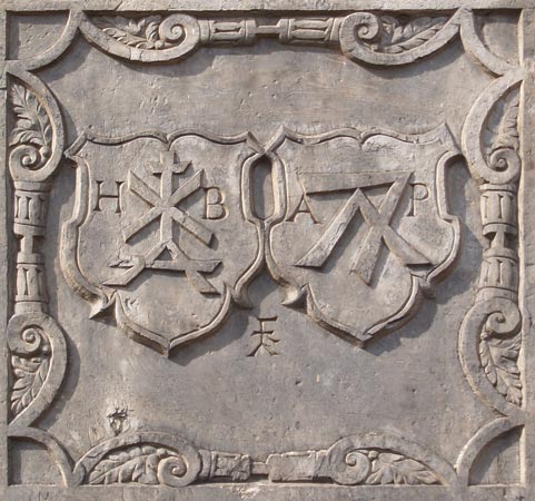 Die beiden Wappen sind von einer rechteckigen Rollwerktafel gerahmt. Sie folgen dem zeittypischen Muster bürgerlicher Wappen, die als Motiv eine Hausmarke besitzen und in Abweichung von heraldischen Prinzipien zusätzlich eine Personalisierung durch Initialen vornehmen. Die Schildfläche wird bei dieser Art von Bürgerwappen zur Projektionsfläche sowohl einer das Haus bzw. die Familie kennzeichnenden Marke als auch einer personenindividuellen Zuordnung durch Initialbuchstaben. Das optische linke Wappen (Hausmarke aus Kreuzkopfschaft mit Mittelschragensprosse und einem von einer Fußkreuzsprosse überschnittenem Sparrenfuß) ist so als H(ieronymus) B(ecker) zugehörig gekennzeichnet, das optisch rechte Wappen (Hausmarke aus einem Sparren, der hinten von einem um 45 Grad nach hinten gedrehten Sparren von dessen linkem Schenkel überkreuzt wird) seiner Frau A(gathe) P(....). Man beachte unter den Wappen das hübsche Steinmetzzeichen.
