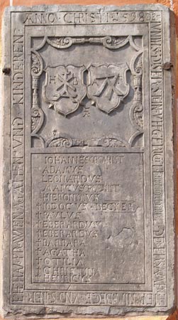 Zwei wunderschöne Hausmarken-Wappen finden wir an der südlichen Außenwand der Pfarrkirche links neben dem Mittelportal. Es handelt sich um eine dort nachträglich positionierte schieferne Grabplatte aus dem Jahr 1598, eine Sammelplatte für die Eltern und deren Kinder. In der äußeren Umschrift werden die Eltern genannt, Hieronymus und Agatha Becker, geb. P....., in der unteren Hälfte des Zentralfeldes sind 14 Kinder aufgeführt, wobei bereits verstorbene mit einem Kreuzchen vor dem Namen gekennzeichnet sind. Mehrere dieser Kinder sind mit der Berufsbezeichnung "Organist" versehen. Die umlaufende Inschrift lautet: "ANNO CHRISTI 1598 DE(N) 5 IVNII IST DI(E)SER STEIN (A)VFFGERICHT(ET WORDEN) [zur begrebnuß] DEN E(H)RSAMEN HIERONIMO BECKER VND SEINER EHEHAVSFRAWEN AGATHEN VND KINDEREN". Dabei findet sich eine Korrekturzone: Der Ursprungstext, vom dem noch die Enden einiger Schäfte der Kapitalis-Großbuchstaben zu sehen ist, wurde vertiefend herausgeschlagen und mit "zur begrebnuß" in Frakturschrift mit Kleinbuchstaben überschrieben. Eine zweite Korektur wurde vorgenommen: Aus "DEM" wurde "DEN", aus einer Einzelplatte konnte so die Deckplatte einer Familiengruft werden. Der Hintergrund für die notwendige Erweiterung und die vielen in kurzer Zeit anfallenden Toten ist vermutlich eine Pestepidemie Ende des 16. Jh.