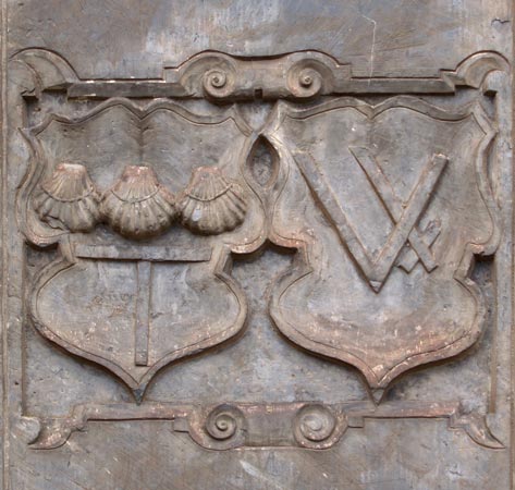 Das Paar ist offensichtlich ein Ehewappen Pletz/Pinter. Das optisch linke Wappen zeigt über einem Antoniuskreus drei Pilgermuscheln balkenweise (Wappen Pletz). Das gleiche Wappen findet sich auf einer in der Michaelskapelle aufgestellten Grabplatte für seine Kinder Ebert, Clara, Anna, Elisabeth und Johann aus zweiter Ehe mit Catharina Turnerse (Wappenschild mit Turm). Das optisch rechte Wappen zeigt eine Hausmarke aus einem Sturzsparren, der hinten einen schrägrechtsgelegten Kreuzfußschaft überkreuzt (Wappen Pinter).