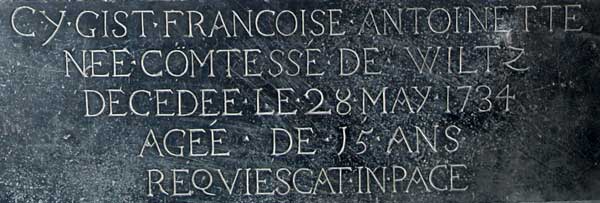 Die Inschrift unter dem Rautenschild lautet: "CY GIST FRANCOISE ANTOINETTE NÉE COMTESSE DE WILTZ DÉCEDÉE LE 28 MAY 1734 ÂGÉE DE 15 ANS REQVIESCAT IN PACE". "CY GIST" ist in heutiger Schreibweise Ci-gît und bedeutet "hier ruht". Nur 15 Jahre wurde die junge Gräfin alt, deshalb ist auch ausschließlich ihr eigenes Familienwappen abgebildet, im Gegensatz zur Tafel gegenüber.