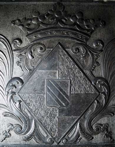 Dargestellt ist das vermehrte Wappen Custine de Wiltz, geviert mit Herzschild. Feld 1 und 4: golden mit rotem Schildhaupt (Wiltz), Feld 2 und 3: schwarz mit silbernen Lilien besät (Lombut), Herzschild: in Silber ein schwarzer, beiderseits von einer ebensolchen Schrägleiste begleiteter Schrägbalken (Custine). Weitere Ausführungen insbesondere zur Entwicklung des Wappens siehe vorherige Seite zum Chorgitter. |