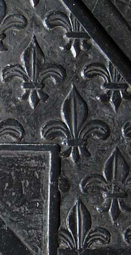 Hier finden wir einen von einer Krone überhöhten Rautenschild, eine Schildform, die insbesondere im frankophonen und angelsächsischen Raum für Damen gebräuchlich war. Es war eine Mode, weil ein mittelalterlicher Kampfschild als unpassend für Frauen empfunden wurde, führte jedoch insbesondere bei mehrfeldrigen Wappen zu einer sehr ungünstigen Flächendisposition. In der deutschen Heraldik hat sich diese Mode nie richtig durchgesetzt. Rechts ein Detail-Ausschnitt, der die hohe Qualität der Ausführung zeigt.