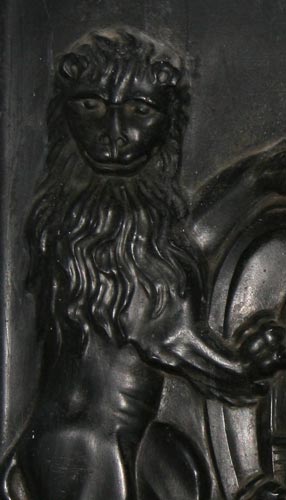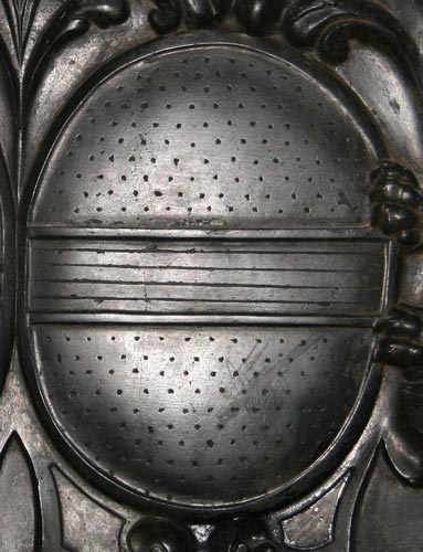 wären blau-golden. Auf dieser Platte findet sich sogar die heraldisch korrekte Schraffur, ein Stilmittel, um dieses Wappen im Vergleich zu dem achtfeldrigen Wappenschild gegenüber nicht gar zu leer erscheinen zu lassen. Gegenüber sind ebenfalls die beiden goldenen Felder mit Punkten versehen, ansonsten das Rot von Koerich und das Blau des Eisenhutfehs und das Rot des Balkens darin. |