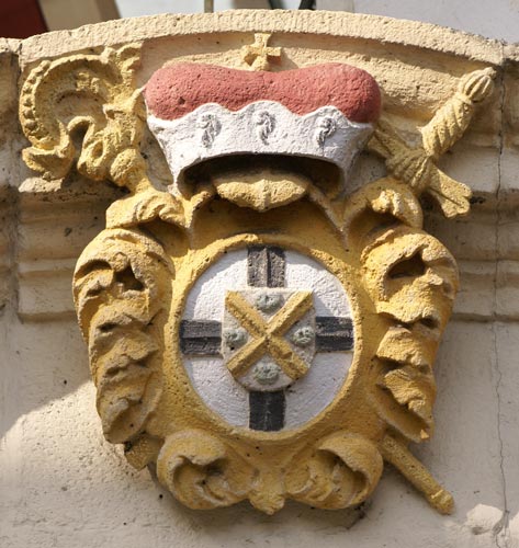 Es ist das Wappen von Fürstbischof Johann Hugo von Orsbeck. Er war bereits 1675 Bischof von Speyer und Propst von Weißenburg und wurde 1676 Erzbischof und Kurfürst von Trier, und diese Ämter hatte er bis zu seinem Tod 1711 inne. Von seinem Wappen gibt es eine ausführliche Variante mit den Elementen Kurtrier, Prümer Lamm, Probstei Weißenburg, Fürstbistum Speyer und Familienwappen, und daneben eine abgespeckte Variante, die wir hier sehen: Hauptschild: In Silber ein durchgehendes rotes (nicht schwarz wie hier, es ist nicht Köln!) Kreuz (Fürstbistum Trier, Kurtrier), Herzschild: Stammwappen von Orsbeck: In Gold (nicht Silber wie hier) ein rotes Schragenkreuz, begleitet von vier grünen Seeblättern (Familienwappen Orsbeck). Das Wappen ist in eine barocke Kartusche einbeschrieben, auf der ein Kurhut liegt. Hinter dem Schild schräggekreuzt Schwert und Krummstab, dem Rang eines Fürstbischofs mit geistlicher und weltlicher Macht entsprechend. Johann Hugo von Orsbeck war es, auf den die Klostergründung zurückging. Die Wallfahrten zu einem wundertätigen Marienbild hatten in seiner Zeit so zugenommen, daß dringend die Pilger betreuendes Personal benötigt wurde, und so gründete er 1680 die 1684 fertiggestellten Klosteranlage und siedelte Kapuzinermönche an. Auf Johann Hugo von Orsbecks Initiative ging auch der Anbau des westlichen Portikus vor der Klosterkirche zurück, desgleichen die prunkvolle barocke Kapelle im Norden des Langhauses. 1813 wurde das Kloster aufgelöst, 1890 kamen Franziskaner.