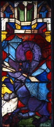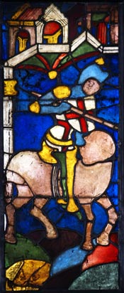 Szenen aus der zweiten Reihe des Haller-Fensters: Links der Hl. Georg als geharnischter Reiter mit dem vom tödlichen Stoß getroffenen Drachen im zweiten Feld, im dritten Feld die noch um Hilfe flehende und schließlich gerettete Königstochter aus der Georgslegende, die in der vom Drachen tyrannisierten Stadt Silena in Lybien per Auslosung zum täglichen Opfer bestimmt war, ganz rechts der Königspalast mit gekrönten Personen in beiden Etagen, die die dramatische Szene beobachten. Alle vier Scheiben bilden eine einzige Szene.