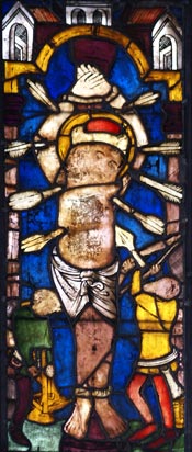 Szenen aus der dritten Reihe des Haller-Fensters: Heiligenfiguren, ganz links Vinzenz von Valencia mit den Haken, als zweites von links Leonhard von Limoges mit Buch und Kette (Befreiung von Gefangenen) sowie mit Tonsur (wird oft als Benediktinermönch dargestellt, obwohl das nicht zutrifft), als drittes von links der an den Pfahl gebundene Sebastian mit den Pfeilen, rechts ein weiterer, nicht identifizierter Heiliger (Märtyrer) mit Palmwedel und Reichsapfel.