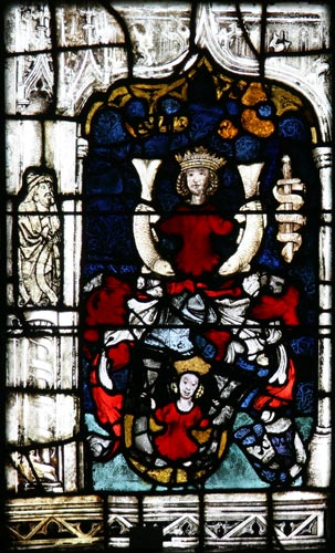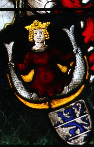 Das vierte Wappen im rechten Bild hat wieder nur einen einzigen Beischild, diesmal mit dem Wappen der von Lichtenstein (ebenfalls fränkischer Landadel), von Rot und Silber im Zackenschnitt quadriert. Beide Wappen lassen sich damit dem 1471 verstorbenen Sebald d. Ä. Rieter und seiner Frau Margarethe von Lichtenstein zuordnen. Das sind die Eltern der Fensterstifter-Brüder. Sebald d. Ä. hatte übrigens auch eine Pilgerfahrt ins Heilige Land unternommen. Zwei Abzeichen rechts und links der Helmzier sind hier noch von Interesse: Das silberne Symbol, eine Art mehrlagiger Kragen mit jeweils schuppenförmig ausgerundetem Rand, könnte das Symbol des 1429 von König Johann II. von Kastilien zur moralischen Festigung der Reconquista gegründeten, aber nur kurzlebigen Ordens de la squama sein, das mit einem Schwertgurt umwickelte Schwert verweist auf das Königreich Zypern (Schwertorden).