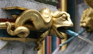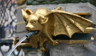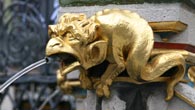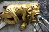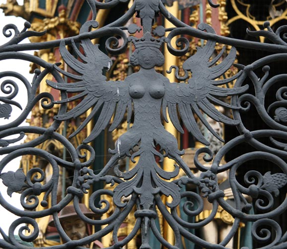 Ebenso ist in das schmiedeeiserne Gitter das Kleine Nürnberger Stadtwappen integriert, gespalten, rechts in Gold ein halber schwarzer nimbierter Adler am Spalt, links von Rot und Silber fünfmal schräggeteilt. Die silbernen Plätze sind jeweils mit einer arabesken Ranke "damasziert", die roten Plätze durchgehendes Blech. Untere Reihe: Verschiedene Wasserspeier am Brunnen.