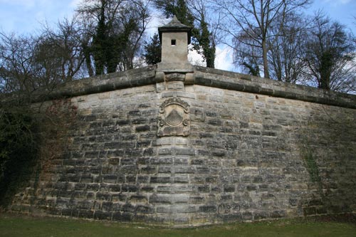 Wenn man die Stadt ausgehend von der "Kaiserpfalz" im Uhrzeigersinn umschreitet, gelangt man entlang einer langen Kurtine, die vom Saltor nach Nordosten führt, zunächst zur Valentini- oder Zwinger-Bastion. Die Bastion folgt dem Umriß eines unregelmäßigen Fünfecks und hat zur Feindseite vier Flächen und drei Ecken. An der südwestlichen Ecke zwischen westlicher Face und südwestlicher Flanke begegnet uns zunächst das Wappen des Georg Heinrich von Künsberg; er war in Bamberg Domdekan, wie die Inschrift erläutert. Die Jahreszahl wird mit 1657 angegeben. Das Wappen der von Künsberg zeigt in Blau eine silberne, eingebogene Spitze. Nicht dargestellt wird die Helmzier, statt dessen zieht sich eine Laubkrone über den oberen Schildrand.