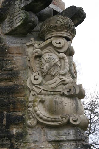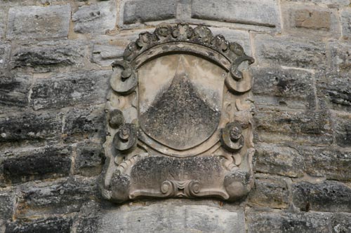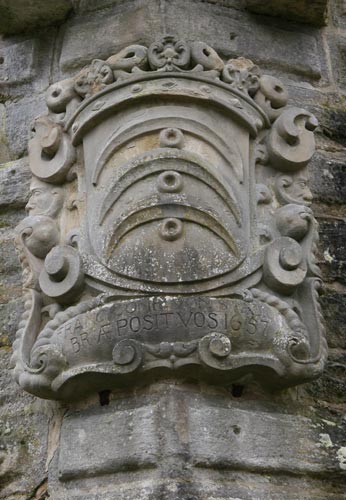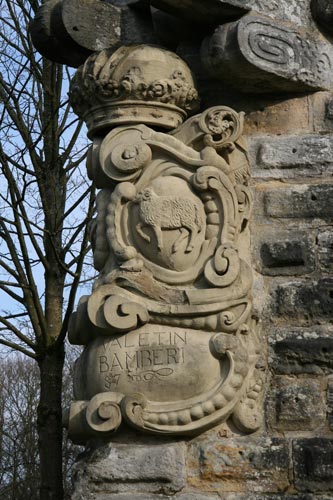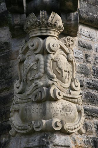 Über dem Wappen die Kaiserkrone des Hochstifts Bamberg (kaiserliche Stiftung), hinter dem Schild schräggekreuzt Vortragekreuz oder Schwert (auf der heraldisch rechten Seite) und Krummstab (auf der heraldisch linken Seite). Die Inschrift unter dem Wappen nennt den Namen des Fürstbischofs Philipp Valentin und die Jahreszahl (muß 1657 sein, tatsächlich ist eher 1687 zu lesen, dieses Jahr liegt jedoch deutlich außerhalb seiner Regierungszeit, und es entspricht nicht den Jahresangaben an den anderen beiden zeitgleichen Wappensteinen).